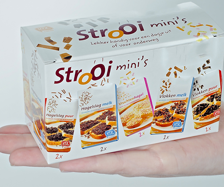 The retail chain was looking for a private label counterpart to the small portion packs of chocolate flakes and (fruit) sprinkles supplied by a well-known, top-level brand. The retail chain provided the artwork for the packaging and selected Budelpack as its partner to supervise the purchasing, logistics and packaging processes, from the purchasing of the chocolate sprinkles and the printed cardboard, right the way through to the filling and supplying of the ready-to-use mini dispensers to the retail chain's distribution centres.